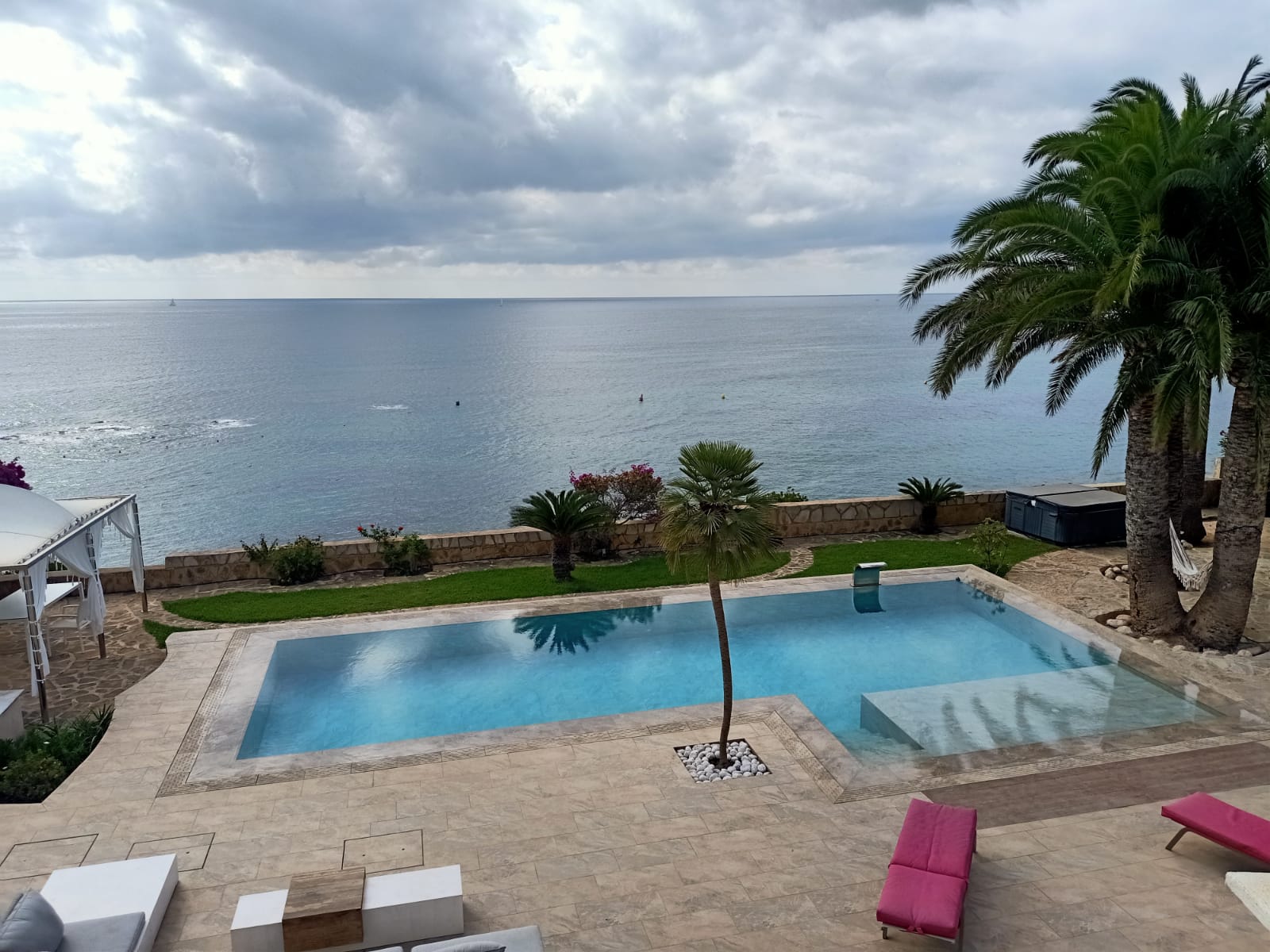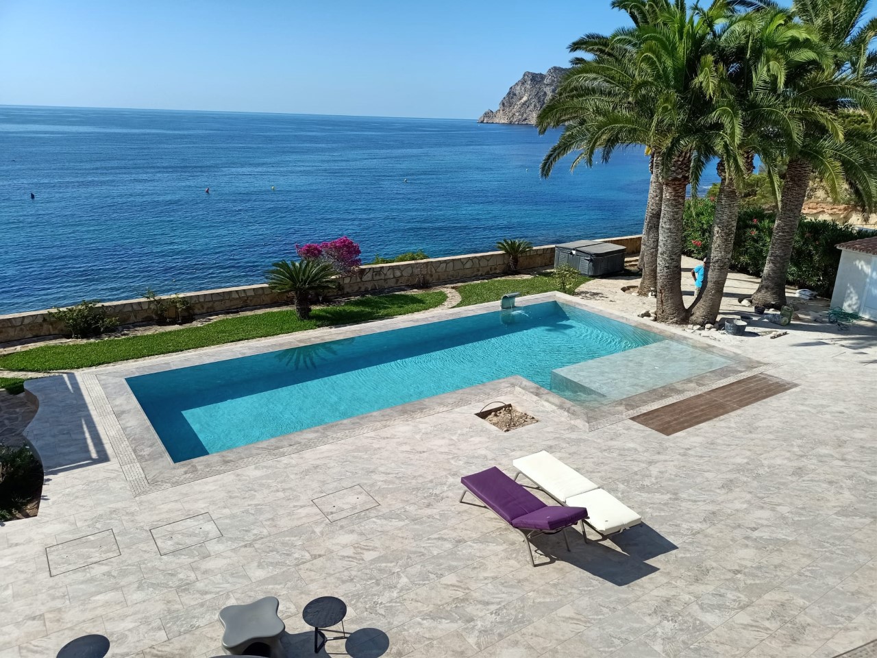 La piscina fue construida con materiales de altas calidades y una cuidada atención al detalle, incorporando un sistema de desborde perimetral con rejilla cerámica, depósito de compensación, escalera integrada y una plataforma interior.