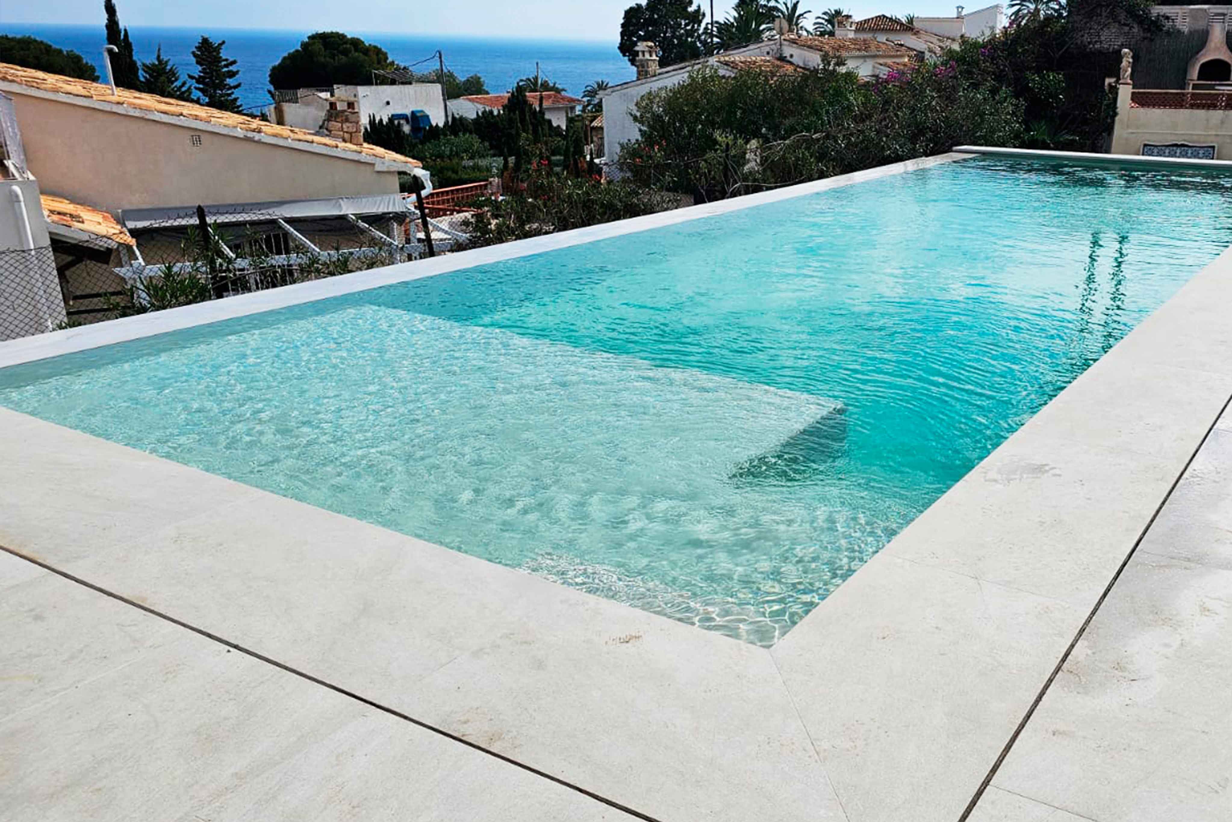 La piscina fue construida con materiales de altas calidades y una cuidada atención al detalle, incorporando depósito de compensación, zona de chapoteo y escalera interior, además de un desborde frontal que aporta continuidad visual y un alto valor estético.